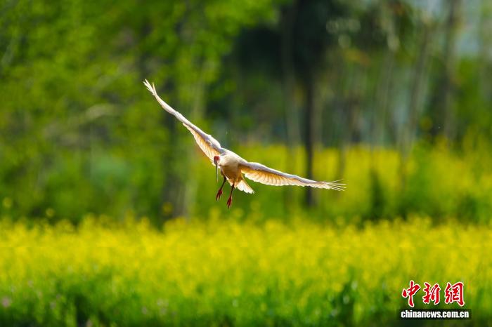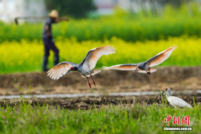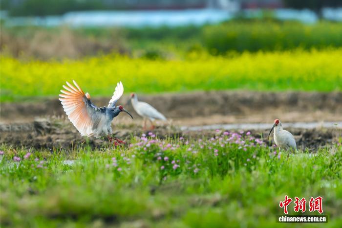 不日,天处秦岭要地的陕西汉中乡固县火稻育秧正闲,墨鹮正在田间穿越,矮飞寻食,组成1幅天然战谐的原野好景。图为墨鹮取油菜花“共框”。 李凶安 摄